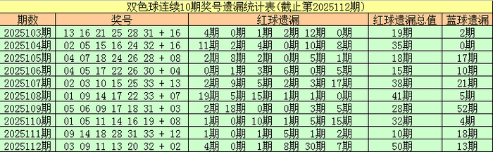 安队第2025113期双色球遗漏分析:(热码:遗漏0-3期,温码遗漏4-9期,冷码遗漏10期及以上)